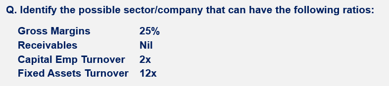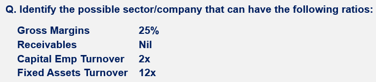 Capital Employed T/o: Comparing this with the Fixed Asset T/o ratio, we conclude that Net Working Capital could be on the higher side. Which means either Investors or Receivables are higher. As receivables are Nil, the sector has a higher inventory. It clearly can't be a service sector company (can be e-comm, retail, QSR). Most likely it's a retail company.