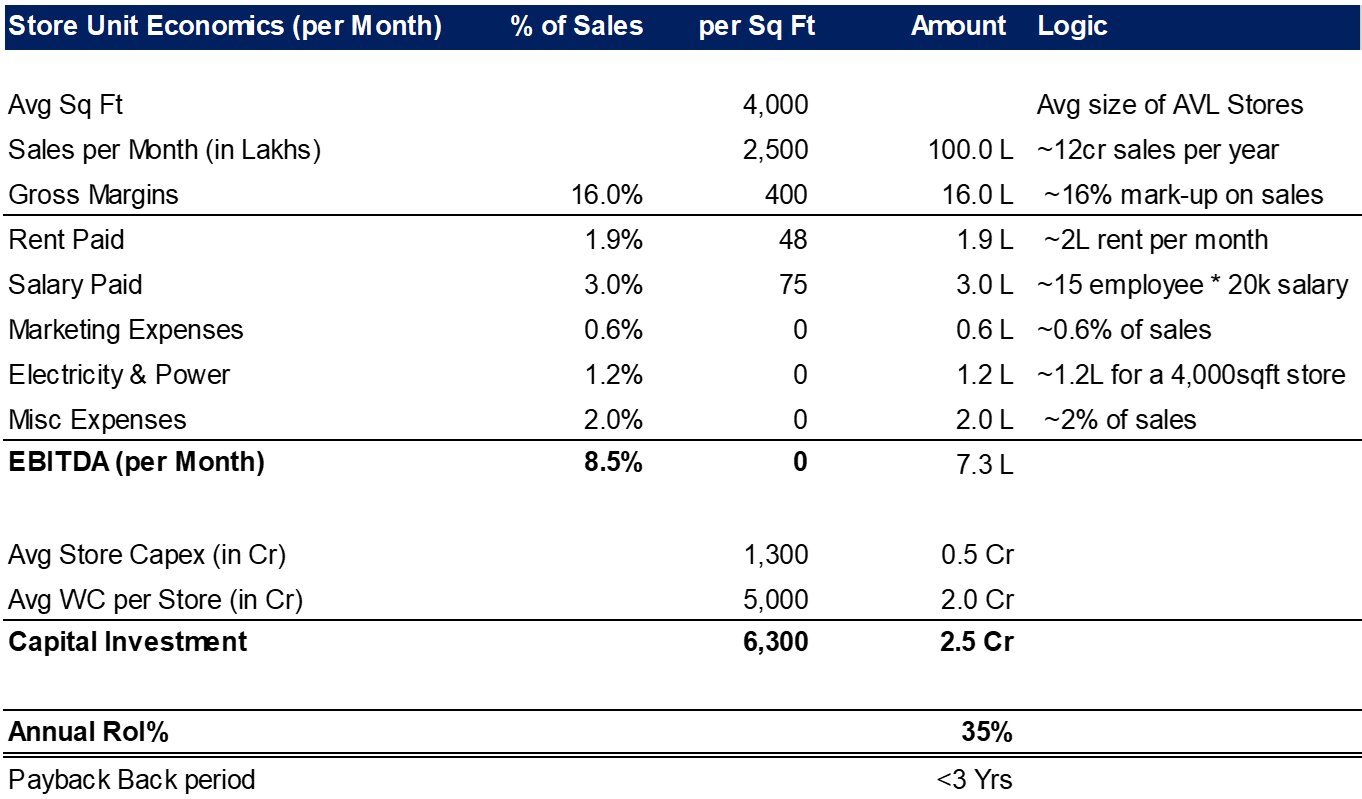 To explain these components using Aditya Vision’s stores, each store needs ~2.5 cr of initial investments, this in turn results in ~12cr of annual sales (i.e a Sales turnover of 4.8x). But of this 12 cr of sales, the company is left with an operating income of ~0.9cr (i.e an Operating margin of 8.5%).