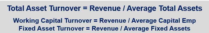 Because this ratio includes both fixed and current assets, inefficient working capital management can distort overall interpretations. It is, therefore, helpful to analyze working capital and fixed asset turnover ratios separately (as Total Assets are roughly equal to Fixed Assets + Working Capital)
