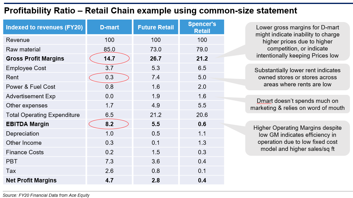 Let us understand the profitability ratios using common-size statements of grocery retailers and connect their business model with the ratio: