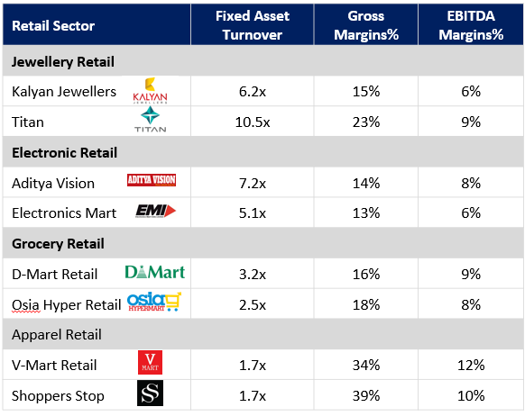 Many analysts make the mistake of comparing Turnover ratios across multiple sectors. Let’s understand the problem this analysis entails. The below table shows the Turnover ratios and Margins of multiple retailers. It clearly shows that Jewellery and electronics are high turnover sectors compared to Grocery and Apparel retailing, largely due to higher ticket sizes. But this lower turnover for grocery/apparel sectors is compensated by higher EBITDA margins in respective sectors.